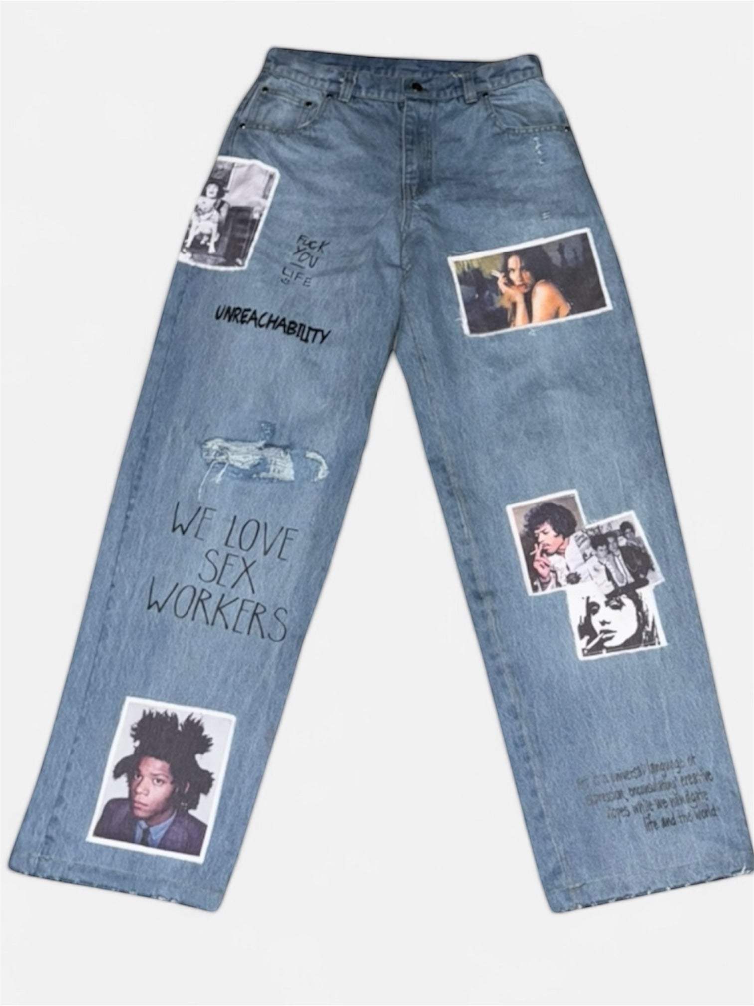 • Relaxed fit straight leg 5-pocket jean • Mt. Vernon USA 14.5oz denim • Mid-wash indigo w/ distressed detailing throughout • Features glitter & holographic heat transfer stickers • Printed original JF artwork faded to mimic hand drawn effect